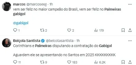 “O Palmeiras monitora a situação do Gabigol, pensando em contratá-lo para janeiro de 2025 de graça. O Gabigol não fica no Flamengo, isso é certo”, confirmou Nicola, que gerou repercussão na web.