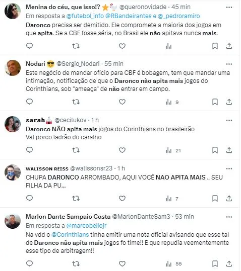 “E até a CBF já está preparada para receber a reclamação do Corinthians. Até pra evitar qualquer tipo de desgaste, Daronco não deve apitar mais jogos do Corinthians no Brasileirão”, concluiu o jornalista do grupo Bandeirantes.
