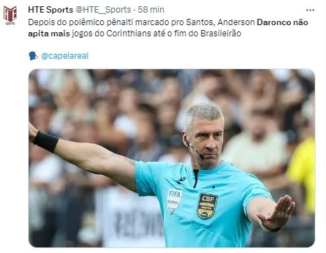 De acordo com o jornalista, Anderson Daronco não vai apitar mais jogos do Corinthians até o final do Campeonato Brasileiro de 2023. Todavia, a entidade só aguarda a solicitação formal para efetivar o veto do árbitro nas partidas do Timão.