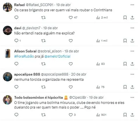 “Então, imagine você: briga o presidente com o diretor de futebol mais o presidente do Conselho Deliberativo, como se sentem o treinador e sua comissão técnica, ambos recém-chegados, e mais um bando de jogadores recém-chegados, alguns dos quais estrangeiros? Ora, o que está machucado nem sequer pensa em voltar a jogar, porque o melhor que ele faz é ficar no Departamento Médico, e os outros estão expostos. O Corinthians tem um jogador que de alguma maneira tenta fazer alguma coisa parecida com futebol, que é o Rodrigo Garro, e ponto”.