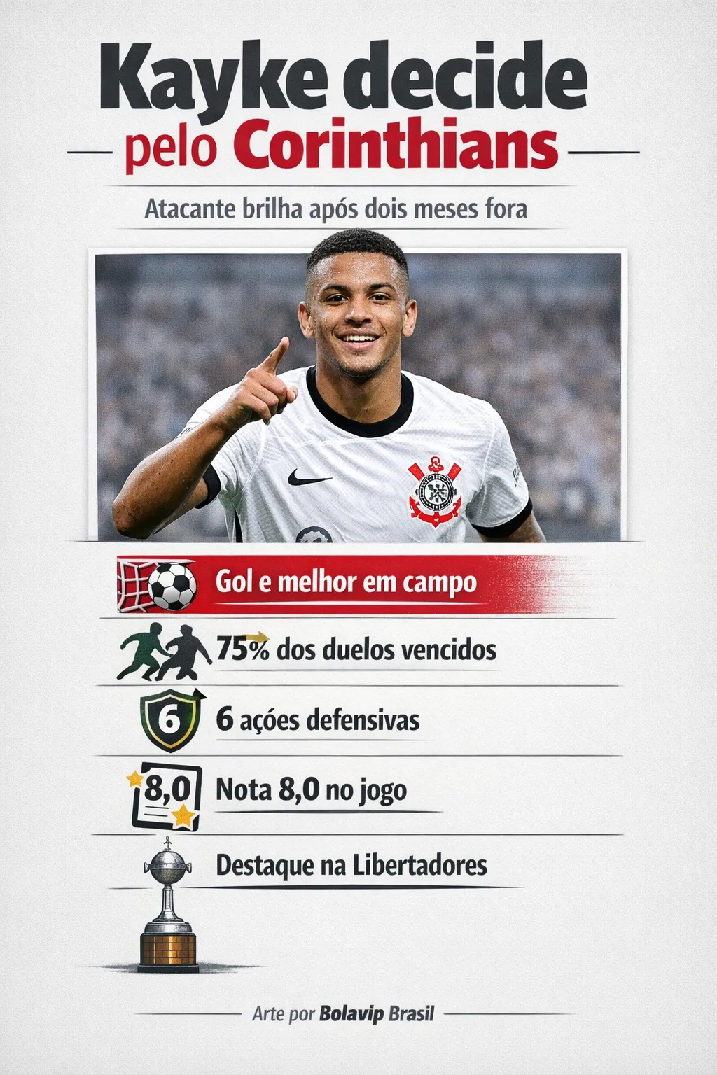 Após quase dois meses sem atuar, Kayke voltou a jogar pelo Corinthians, marcou um gol e foi eleito o melhor em campo, sendo peça fundamental na vitória da equipe na estreia da competição continental. O retorno reforça sua importância dentro do elenco neste momento da temporada.