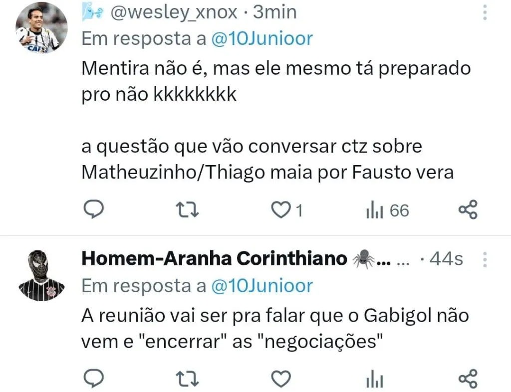 “Falei com o Landim e Braz sobre o interesse de me reunir com o atleta. Se for autorizado, vamos conversar. Existe um titular lá, então podemos conversar. Temos uma boa relação, uma parceria entre Corinthians e Flamengo, é a união do futebol. “, confirmou.