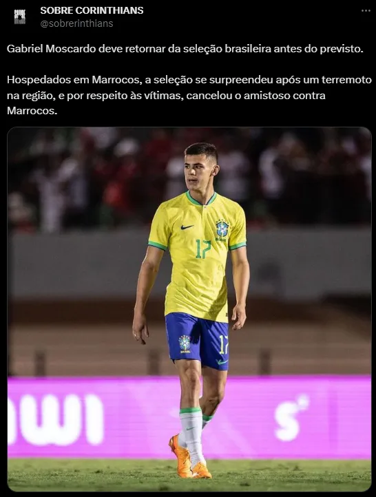 O volante Gabriel Moscardo, que estava com a delegação da Seleção Brasileira Pré-Olímpica no Marrocos, retornou ao Brasil nesta segunda-feira (11) após o cancelamento de um amistoso devido a um terremoto que atingiu a região, resultando na morte de pelo menos 2.100 pessoas. A delegação estava na cidade de Fez, que foi pouco afetada pelo terremoto.