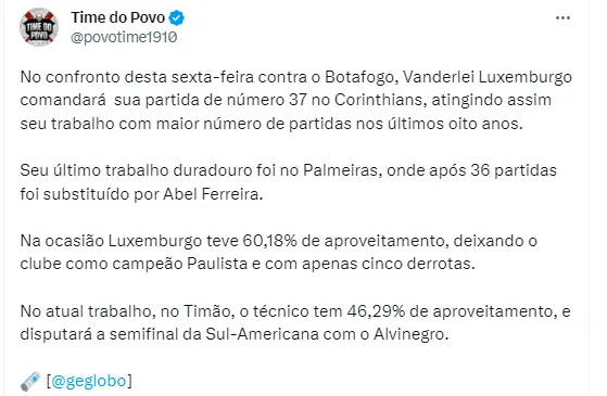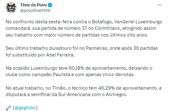 Inclusive, o treinador Vanderlei Luxemburgo vem muito pressionado no cargo, mesmo com a equipe prestes a disputar a semifinal da Copa Sul-Americana. Nesta passagem pelo Timão, o comandante vai completar 37 partidas à frente do Time do Povo e isso fará com que ele consiga um feito pessoal muito grande. Será o trabalho mais longo de Luxa nos últimos oito anos, deixando assim sua última passagem pelo Palmeiras para trás.