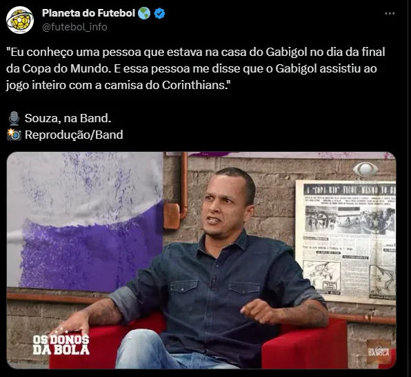 “Eu conheço uma pessoa que estava na casa do Gabigol no dia da final da Copa do Mundo. E essa pessoa me disse que o Gabigol assistiu ao jogo inteiro com a camisa do Corinthians”, afirmou Souza ao vivo durante o programa.