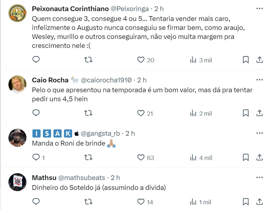 Trata-se do jovem atacante Felipe Augusto, que deve ir jogar no Club Brugge, da Bélgica, De acordo com a reportagem do site da ESPN, o time belga ofereceu ao Corinthians 3 milhões de euros (R$ 16 milhões na cotação atual) pelo jogador.