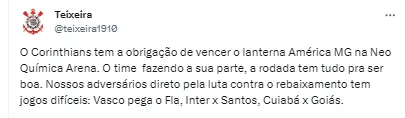 O Corinthians já foca no próximo compromisso do Campeonato Brasileiro. Na última partida, a equipe do técnico Mano Menezes vencia fora de casa por 3 a 1 diante do Fluminense, mas acabou sofrendo um empate e trouxe um ponto para São Paulo. Neste domingo (22), a equipe recebe o América-MG, na Neo Química Arena, às 18h30 (de Brasília), visando voltar a vencer.