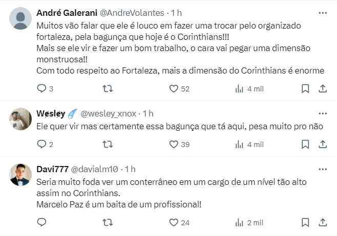 Dentre as insatisfações da torcida, dirigentes mais profissionais no Corinthians são cobrados. Por isso, o nome de Marcelo Paz, CEO do Fortaleza, começou a ser ventilado no clube.