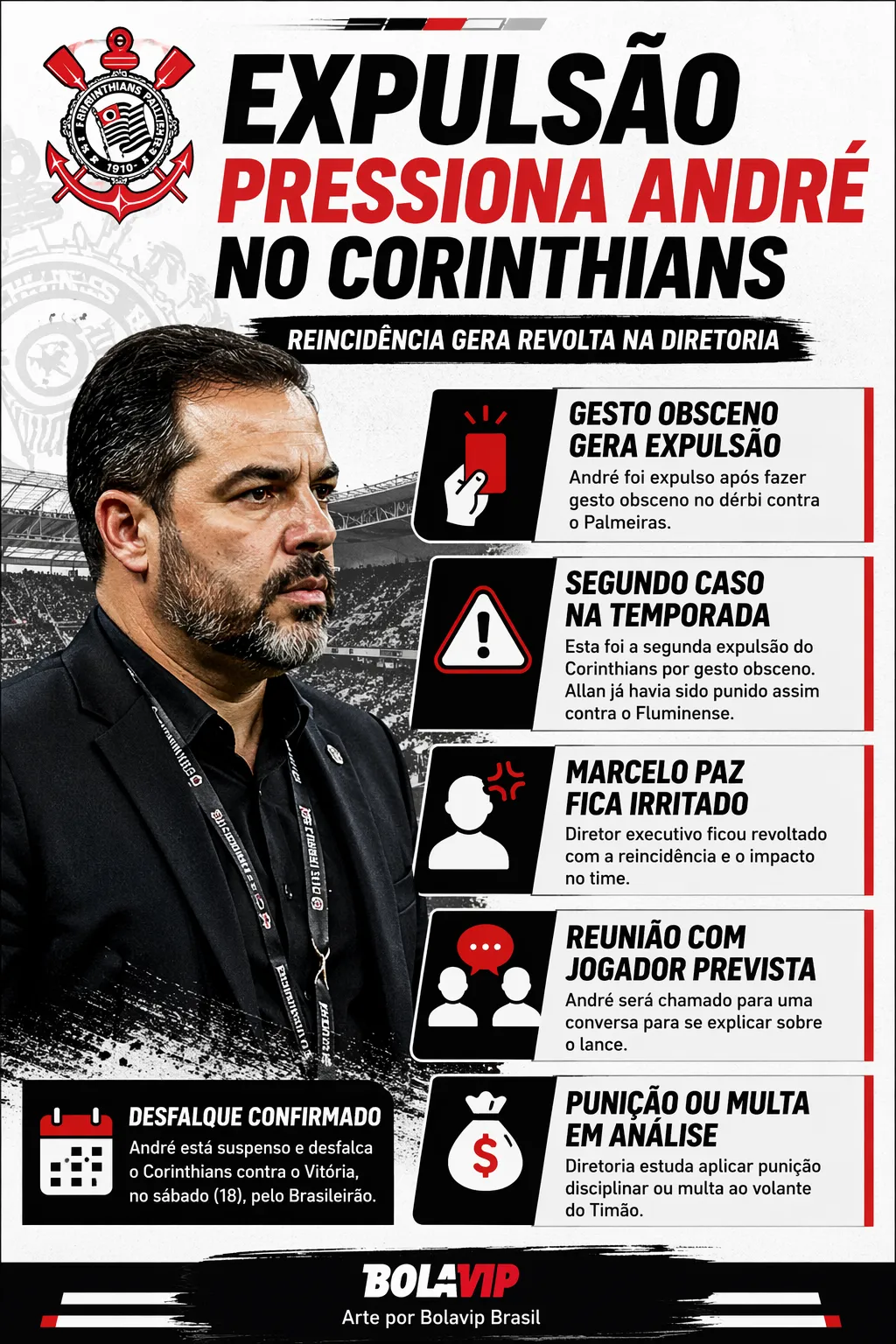 O Corinthians teve dois jogadores expulsos contra o Palmeiras e segurou o empate no dérbi de domingo (12), na Neo Química Arena, pela 11ª rodada do Brasileirão. O clube paulista deve adotar medida disciplinar contra André.