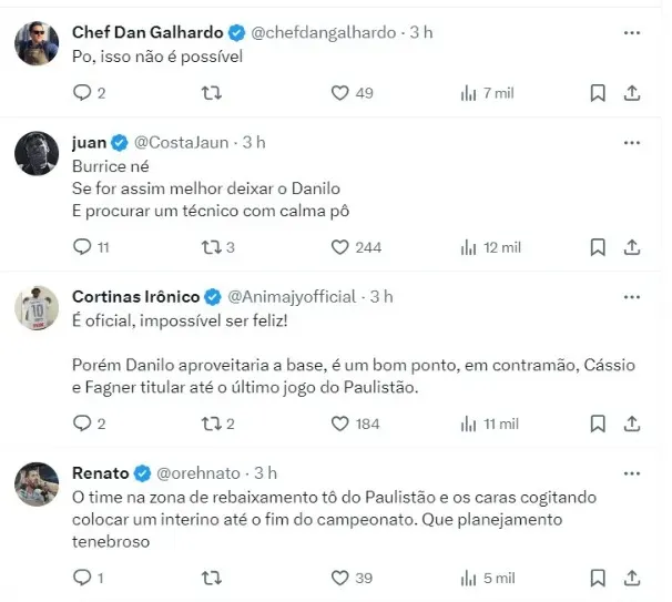 “A nova direção do Corinthians, 33 dias após assumir o clube, decidiu pela interrupção do nosso trabalho. Agradeço ao torcedor corinthiano que sempre foi muito carinhoso e respeitoso comigo e com a minha equipe. E também a todos os profissionais que estiveram comigo nesses 5 meses de trabalho. “Sempre em frente”! Abraços”, escreveu em sua conta oficial no Instagram.