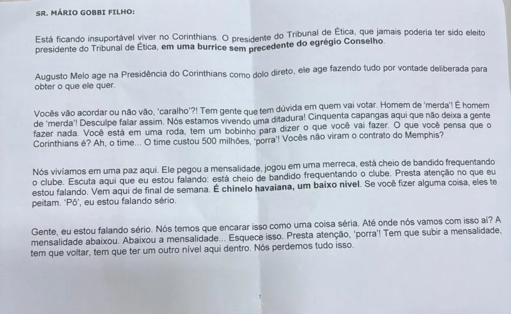 Durante o evento, o ex-presidente Mário Gobbi proferiu críticas aos associados do Corinthians. A equipe do Bolavip teve acesso ata da reunião que aconteceu no início do mês passado, onde o Gobbi ofendeu o Presidente do conselho de ética e, na sequência, fez duras criticas a Augusto Melo.