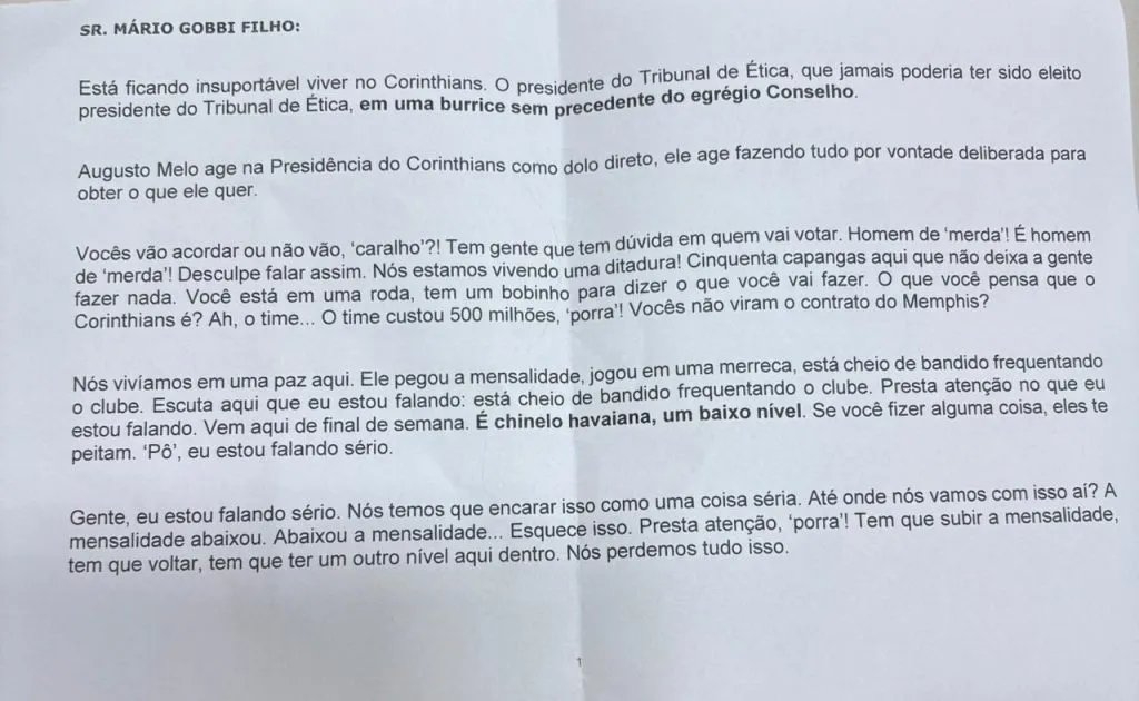 Outros alvos foram o presidente Augusto Melo, que foi ofendido diversas vezes por Gobbi. Em um dos trechos da nota, Mário disse que o atual comandante do Corinthians precisa acordar.