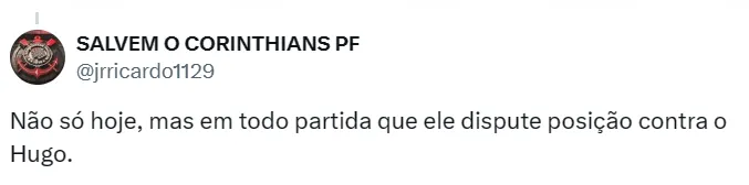 “Eu falava pra ele que era pra ele estar jogando. Mas o Corinthians isso, vai te jogar pra cima ou lá pra baixo. Você tem que estar preparado pra esse tipo de situação. Tem que amadurecer com isso, aprender com os erros. Porque, às vezes, você não tem uma segunda oportunidade, né? Agora, por exemplo, ele não foi relacionado no Paulista. Então, ele pode ter deixado passar a chance da vida dele”, analisou.