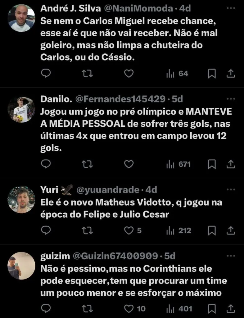 Apesar disso, as chances foram diminuídas com a presença constante de Cássio na meta alvinegra e a ascensão de Carlos Miguel. Hoje, o jogador é a terceira opção da meta corinthiana para o ano e seu estafe está incomodado com a falta de chances.