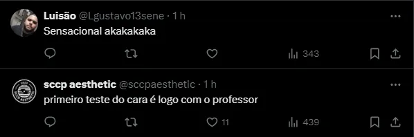 “Primeiro teste do cara é logo com o professor”, “Prova prática com o Mister” e “treina y joga”, foram alguns dos comentários dos torcedores corintianos, que estão mais aliviados com a boa fase do time.