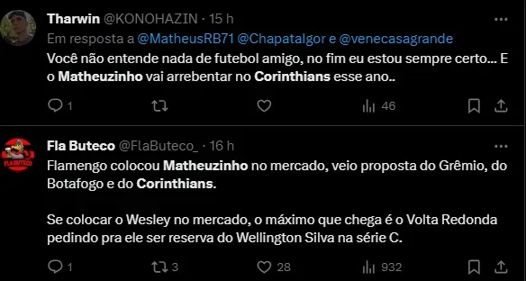 “Matheuzinho está em aberto, estamos falando sim, temos interesse no atleta. É importante falar que o jogador está muito fechado com a gente, quer o Corinthians. Nós estamos por detalhes. Estamos conversando com o Flamengo e esperamos resolver a situação”, disse Fabinho.