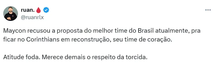 “Maycon fica no Corinthians. O Timão apresentou um projeto ao volante, pediu um voto de confiança e convenceu o jogador a ficar. Maycon tomou a decisão após uma longa reunião com a diretoria paulista. Com isso, o Flamengo não consegue a contratação do atleta mesmo que chegasse a um acordo com o Shakhtar”, escreveu Venê.
