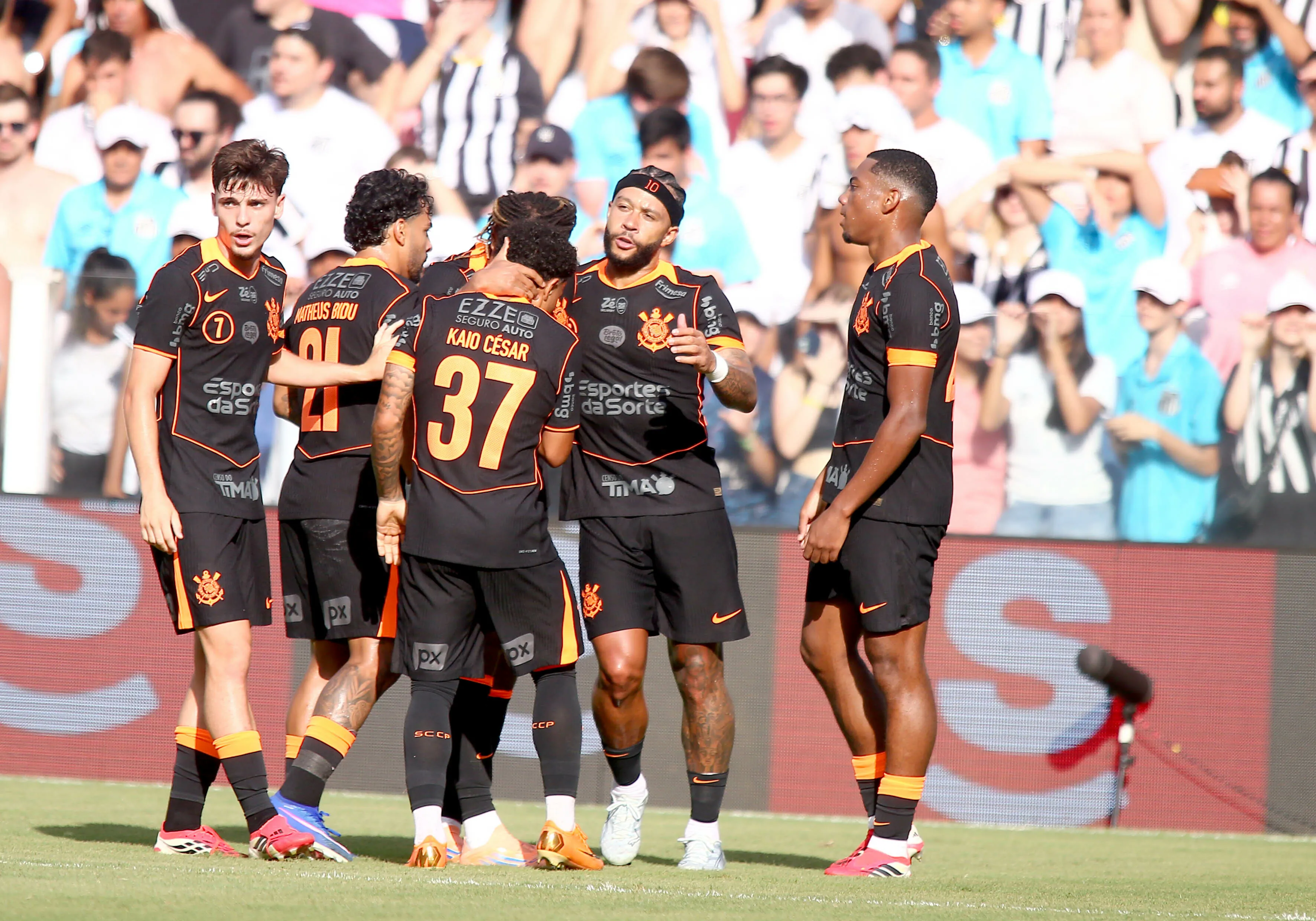 O Timão largou na frente no clássico contra o Santos. Aos 17 minutos da etapa inicial, o Corinthians aproveitou um contra-ataque bem executado para abrir o placar com Memphis Depay.