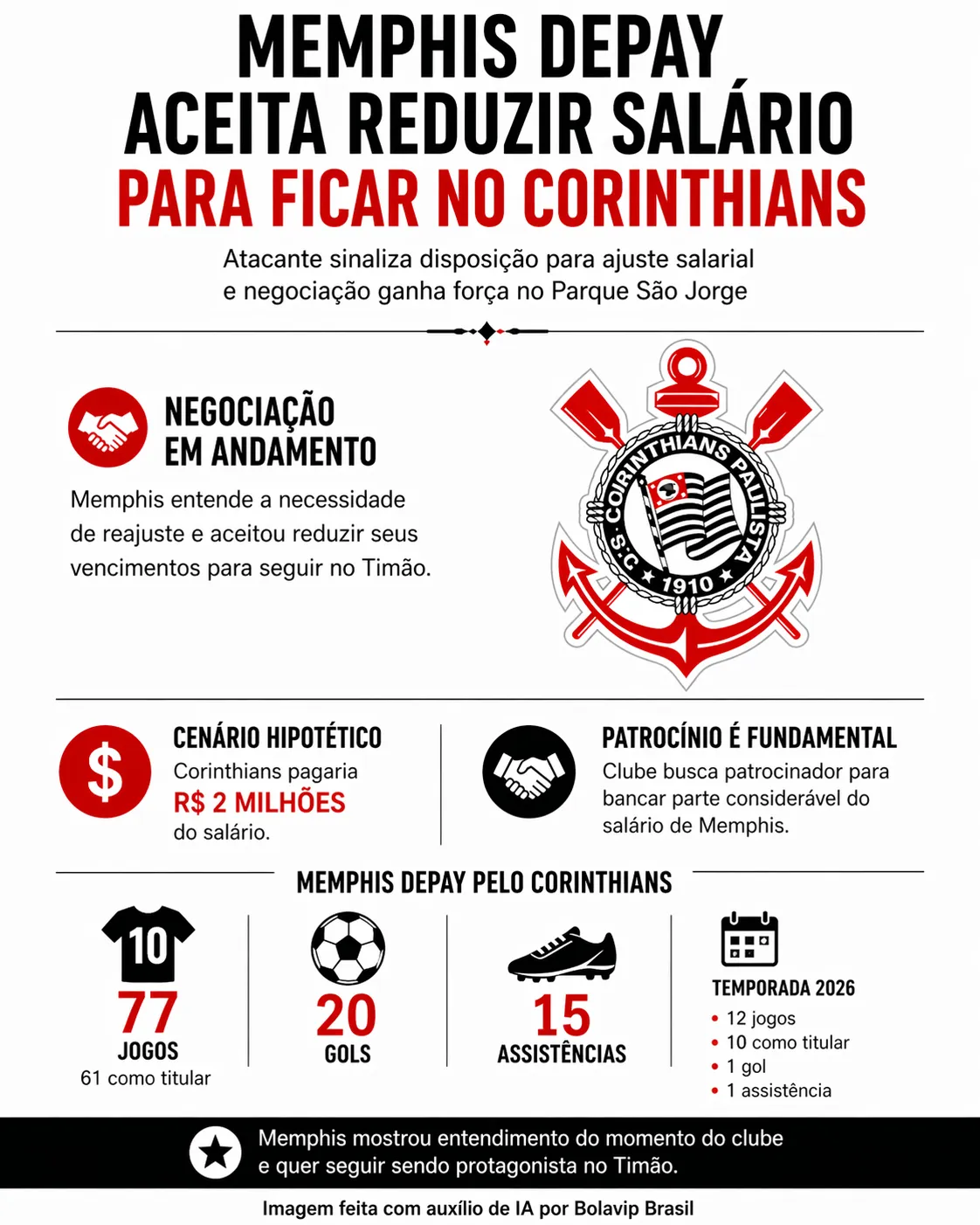 “Independentemente do aceite do Memphis em reduzir o salário, o Corinthians precisa de um patrocinador que banque pelo menos uma parte considerável do salário do Memphis. Se o Memphis aceitar uma redução de 6 para 4, o Corinthians paga R$ 2 milhões. Isso é um cenário hipotético”, explicou Lázaro.