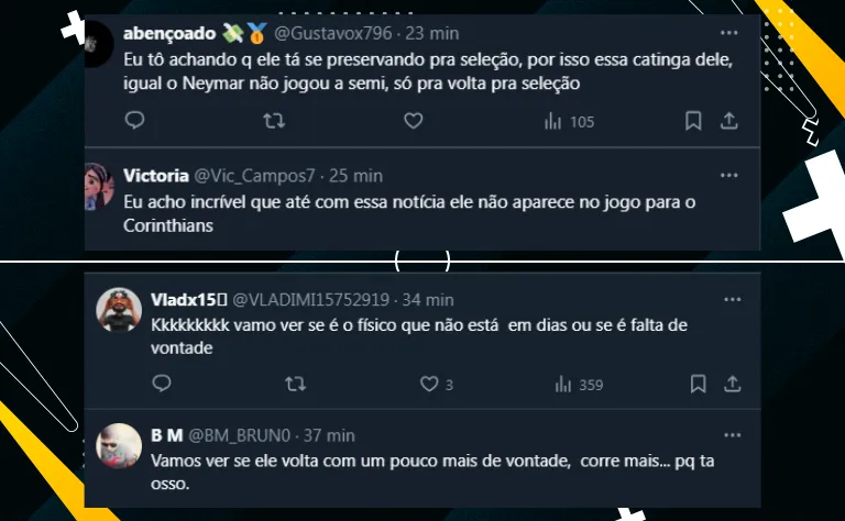 Por fim, como o coletivo do Coringão também vem decepcionando, o nome de Memphis na convocação da Holanda gerou críticas da torcida alvinegra. Confira abaixo as opiniões mais quentes: