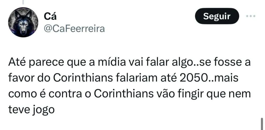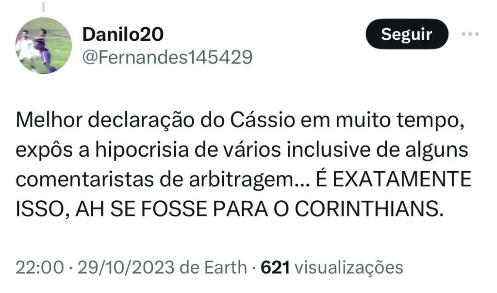 “Vamos ver se vão falar tanto quanto falam quando o erro é para o Corinthians, a ênfase que dão, que é sempre Corinthians. Mas sempre vão achar um arbitrozinho que vai dizer que “por esse ângulo”, afirmou Cássio que continuou.