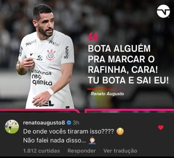 “Bota alguém pra marcar o Rafinha, cara! Tu bota e sai eu”, teria dito Renato Augusto ao treinador, que teria respondido: “Calma, Renato”. Porém, o jogador do Timão se posicionou sobre a postagem e esticou a polêmica rebatendo sobre o que foi publicado.