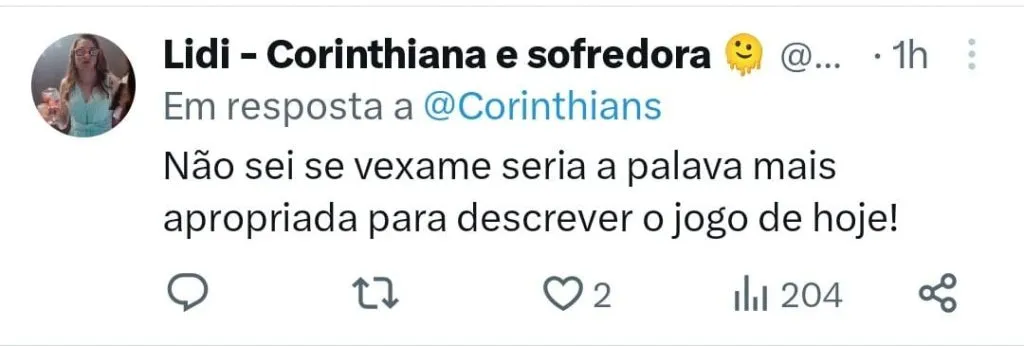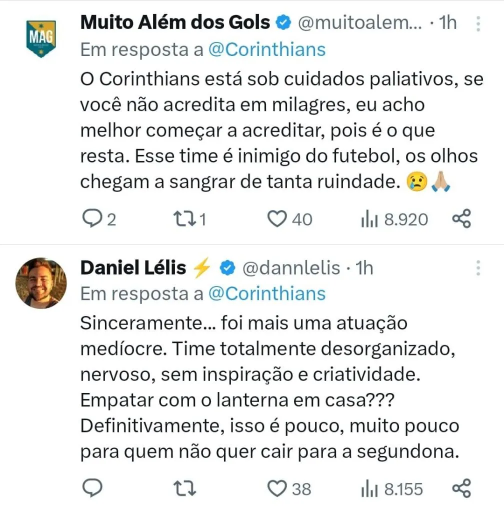 O Corinthians não vence há quatro rodadas e está há apenas três pontos da zona de rebaixamento. “É um momento conturbado nosso, um momento desconfortável na tabela. Não conseguimos uma boa sequência de performance, de resultados, tem sido um ano bem difícil para nós. Faltou um pouco mais de capricho, mas é um caminho que estamos percorrendo. Jogar no Corinthians tem um peso muito grande, mas estamos trabalhando todos os dias para reverter essa situação”, comentou.