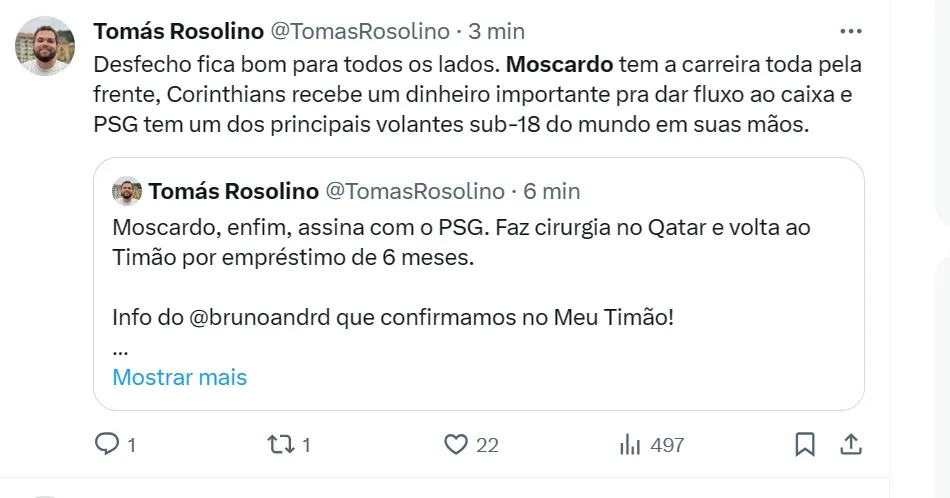 Só que, sete horas antes da partida, o Timão recebeu uma bela notícia. A venda de Gabriel Moscardo ao PSG, de fato, ocorreu, porém o volante vai poder defender o time do coração até o meio do ano.