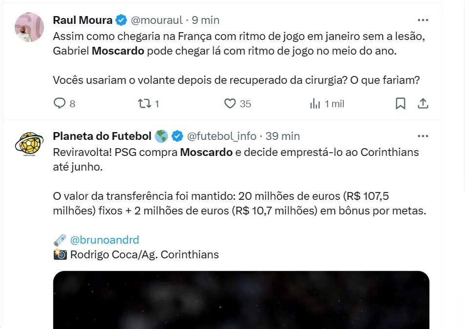 Moscardo precisa, no entanto, se recuperar de cirurgia no pé esquerdo. Financeiramente, o Alvinegro se beneficia ao receber o dinheiro do PSG de imediato, algo que era desejo da direção corintiana.