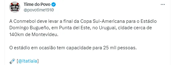 Falando na competição continental, a Conmebol ficou perto de tomar uma decisão que vai influenciar diretamente o Timão, caso a equipe passe da semifinal. Isso porque a Itatiaia revelou que há uma boa chance que a final marcada para o dia 28 de outubro não seja mais no Estádio Centenário, em Montevideo. No entanto, novas informações apontam que o jogo vai continuar no Uruguai.
