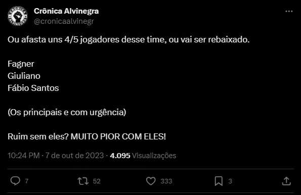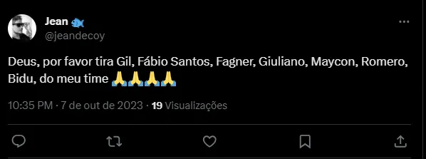 “Ou afasta uns 4/5 jogadores desse time, ou vai ser rebaixado. Fagner Giuliano Fábio Santos (Os principais e com urgência) Ruim sem eles? MUITO PIOR COM ELES”, “Saiu Moscardo. Nossa preocupação aumenta! Até porque não dá pra confiar em Giuliano, Fausto Vera, Cantillo, Maycon! O Corinthians tem volantes hoje. Que não dão saída. Não distribuem jogo. Não conseguem marcar. Estão mal na posição. Tá difícil!” e “Deus, por favor tira Gil, Fábio Santos, Fagner, Giuliano, Maycon, Romero, Bidu, do meu time”, foram alguns dos comentários.