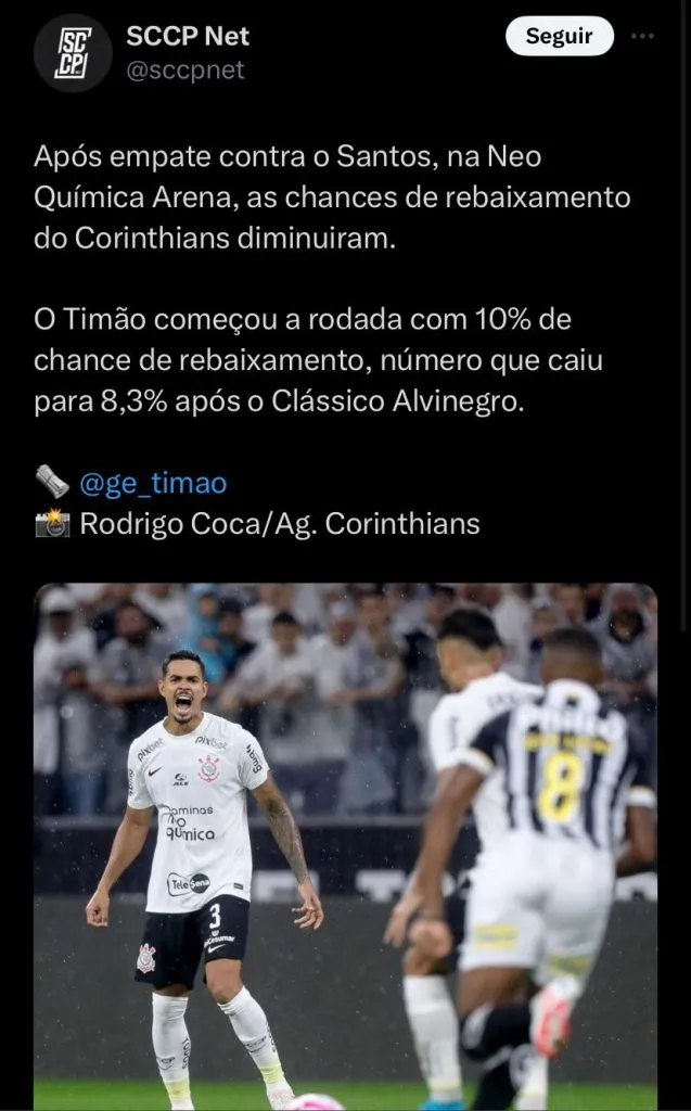 No último domingo (29), o Corinthians empatou mais uma partida na Neo Química Arena, dessa vez o Timão ficou na igualdade com o Santos. A partida foi válida pela 30ª rodada do Brasileirão e terminou em 1 a 1.