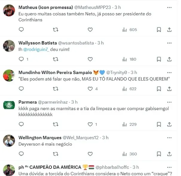 “E quem for o diretor de futebol no ano que vem, seja do lado do André Luiz Oliveira ou do Augusto Melo, vai tentar contratar ele, porque o Mano quer. Eles podem até falar que não, mas eu estou falando que eles querem!”, completou.