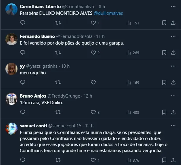 Posto isso, mesmo com a possibilidade de arrecadação alta na próxima janela, o torcedor do Corinthians aproveitou a divulgação do assunto para detonar Duílio Monteiro Alves na web.