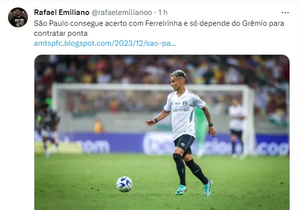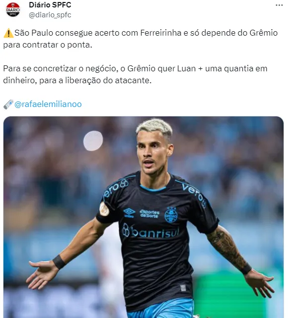 De acordo com informações do setorista do Tricolor Paulista, Rafael Emiliano, o São Paulo chegou a um acerto com o atacante e só resta finalizar o acordo com o Grêmio para que o negócio seja fechado.