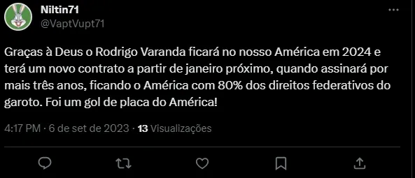 De acordo com a Itatiaia, Rodrigo Varanda, que está emprestado pelo Corinthians ao América-MG, deve assinar um novo contrato com o Coelho ao final desta temporada, período em que encerra o seu empréstimo, mas também termina o seu vínculo com o Timão. Portanto, o jogador, revelado no Clube, não deve mais vestir a camisa corintiana.