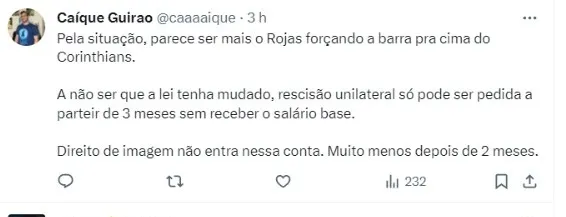 “Pela situação, parece ser mais o Rojas forçando a barra pra cima do Corinthians. A não ser que a lei tenha mudado, rescisão unilateral só pode ser pedida a parteir de 3 meses sem receber o salário base. Direito de imagem não entra nessa conta. Muito menos depois de 2 meses“, completou.
