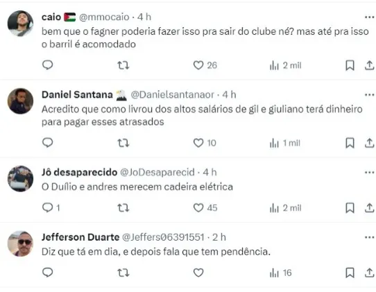 “Rojas tá na razão dele. Pensar o contrário é validar o amadorismo do atual departamento de futebol corinthiano Mas também fica claro que Rojas não quer seguir no Corinthians. O que já era de se imaginar pela não prática do esporte futebol em seus últimos jogos“, disse um torcedor.