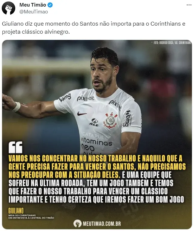 Precisando vencer para seguir se afastando do Z-4, o Santos não deverá facilitar as coisas para os donos da casa, e Mano Menezes sabe o que esperar. “Eu não acredito que o Santos vai ao nosso estádio para se defender. Eu acho que o Santos vai jogar o que sempre jogou, e eu acredito em um grande jogo entre as duas equipes, mais uma vez”, concluiu o treinador do Corinthians.