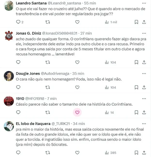 “Cássio terá homenagens modestas na saída do Corinthians. Clube planejava ações na arena domingo, mas a suspensão da rodada atrapalhou. Na 4ª ele já estará no Cruzeiro. Goleiro também quis evitar muita badalação (“não está se aposentando”, argumentou uma pessoa próxima a ele)“, escreveu o jornalista no X.