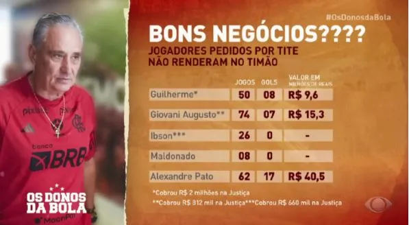 Durante o programa Os Donos da Bola desta quarta-feira (11), Neto fez uma lista com inúmeros jogadores pedidos por Tite, que na verdade, complicaram as finanças do Clube com dívidas e não desempenharam o esperado dentro de campo. “Bons negócios. Jogadores pedidos por Tite. Não renderam no Timão e isso deixou uma dívida violenta. Guilherme: 50 jogos, oito gols, R$ 10 milhões. Giovanni Augusto: craque, fenômeno, maravilhoso. O primeiro cara que fez gol na Arena, pelo Figueirense. 74 jogos, 7 gols. R$ 15 milhões, fora o que ganhou na Justiça. Ibson: craque, fenômeno, o Tite falou que ele seria o Zidane. 26 jogos, 0 gol.”