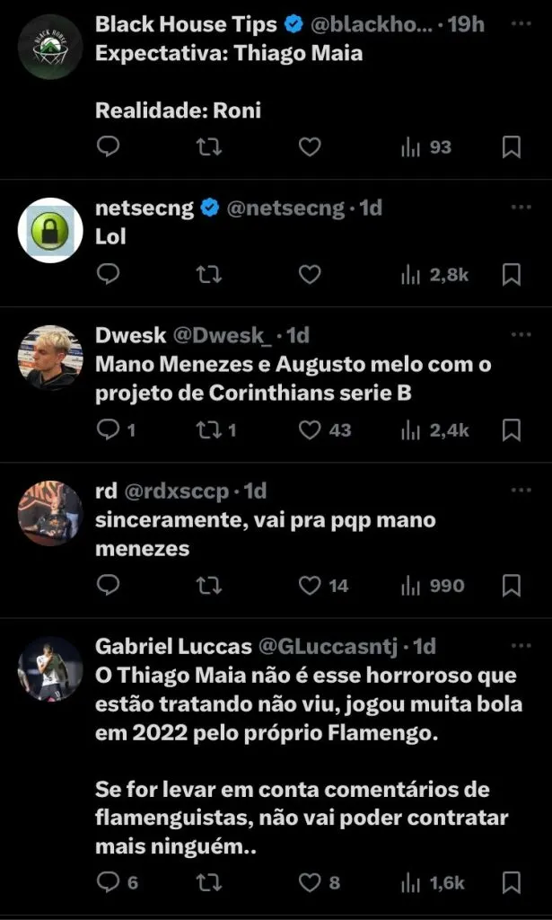 O Corinthians tem interesse na contratação de Thiago Maia, do Flamengo. O nome do jogador foi levado na mesa da nova diretoria, e o técnico Mano Menezes gosta do estilo.