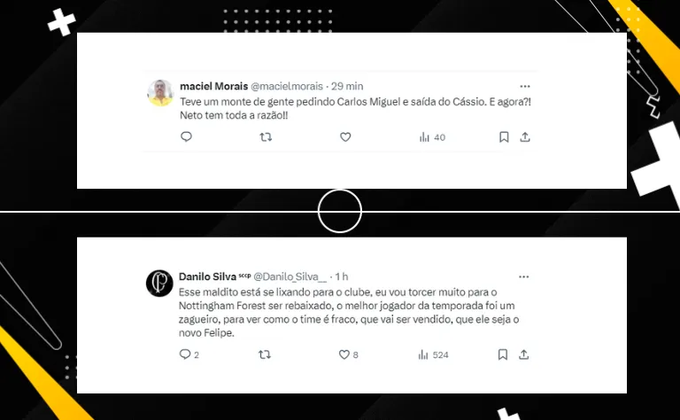 O ex-jogador ainda criticou duramente o goleiro: “Você mostra o quanto você é pipoqueiro (Carlos Miguel). O quanto você não merece vestir a camisa do Corinthians. Enquanto você não é ninguém em relação ao que foi o Cássio, ou do que é o Fagner, o que fui eu, o que foi o Rivelino, do que foi Basílio, do que foi Marcelinho, do que foi Sócrates. Você nunca mais deveria vestir a camisa do Corinthians”, disse Neto em um trecho do vídeo.