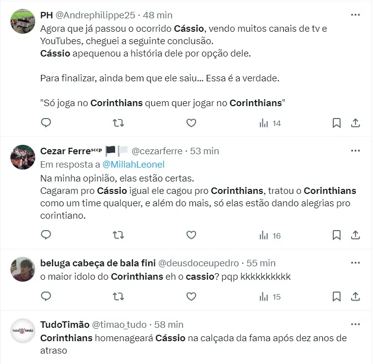 O apresentador ainda criticou o evento de despedida realizado pelo clube paulista: “Pra mim foi uma festa mequetrefe. O ambiente estava legal, mas o Cássio merecia coisa melhor. Não tinha nem que ter saído do Corinthians”.