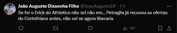 Com essa revelação, a Fiel já começou a especular alguns nomes que o Alvinegro pode trazer. Um deles é o volante Erick, que joga no Athletico. O Timão já foi atrás dele, mas as propostas foram recusadas.