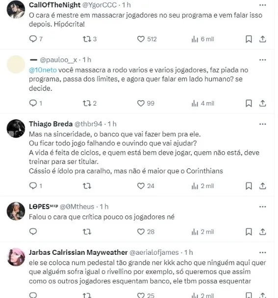 “Não é deixar o Cássio na reserva. É cuidar do ser humano! É nítido que ele precisa de ajuda. É o maior ídolo da história. Não é possível que vão fazer a mesma coisa que fizeram comigo, de eu achar que não prestava, de ter saído pela porta dos fundos. (…) Aconteceu com o Marcelinho, com o Sócrates, com o Edilson, com o Rivellino. Vocês são trituradores de ídolos. O Cássio não merece isso“, afirmou o apresentador.