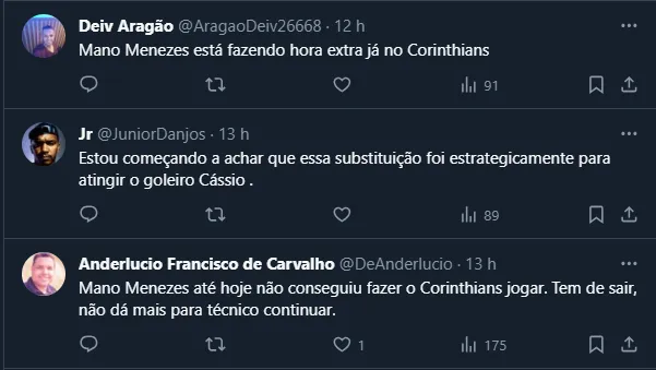 No momento, por mais que Mano Menezes tenha sido garantido no cargo e dado entrevista coletiva ontem (27), a torcida já vem sugerindo nomes de novos treinadores, como Vítor Pereira, só para se ter ideia do tamanho da insatisfação com o trabalho de Mano.