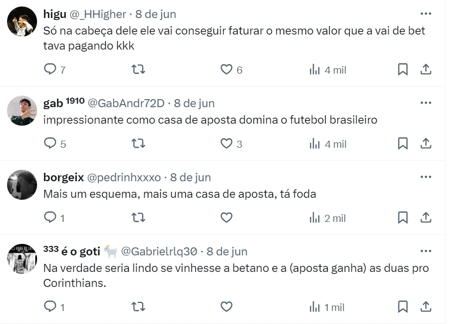 “O Timão procurou a Aposta Ganha para retomar uma negociação, que havia se iniciado em dezembro. Além disso, a Bet7k, patrocinadora do Neto, tem tentado crescer no futebol brasileiro é outra possibilidade. Há quem fale também em Betano e Stake”, completou Jorge Nicola.