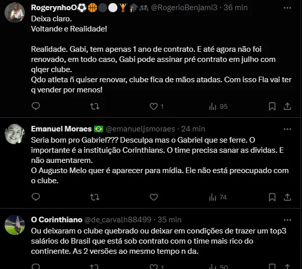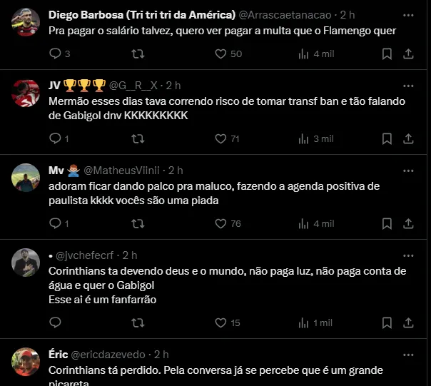 “Corinthians tem total condição. Gabigol é um grande jogador. Por que não tentarmos uma boa conversa? Queremos sentar com o pessoal do Flamengo. Há interesse dos dois lados. Por que não tentarmos?”, disse o mandatário.