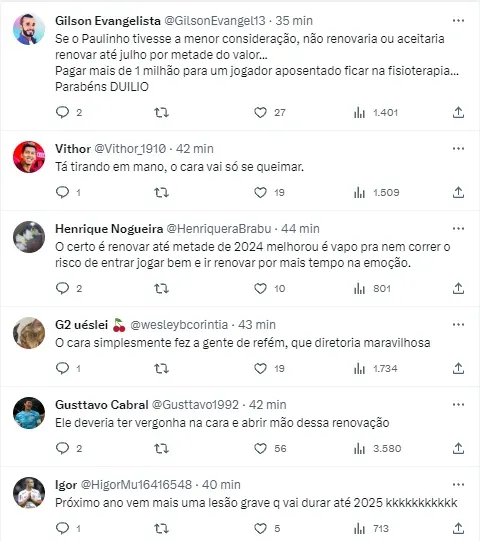 De acordo com Samir Carvalho, ao menos é isso que negocia agora Paulinho e Corinthians. O caso chegou a surpreender a Fiel, que apesar de ter enorme carinho com o ídolo campeão da Libertadores e do Mundial de 2012, não vê mais clima para a permanência. Aos 35 anos, o volante acumula lesões desde o seu retorno ao Parque São Jorge e ficou longe de apresentar aquele futebol que encantou nos tempos de Pacaembu. As tratativas devem ser concluídas em breve e a renovação anunciada.
